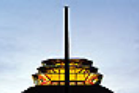 The copper sheeting, weathered over time, will develop a greenish patina, accentuating the monumentality of the pyramidal form. The heavily-rusticated base effectively counter-balances the strong roof geometry. The column supporting the roof are deeply recessed from the roof perimeter, giving the impression of the roof floating over the podium. This imagery is more effective at dusk, when the roof appears to be supported on a band of light which bursts forth, volcano-like, through the occulus at the apex.
