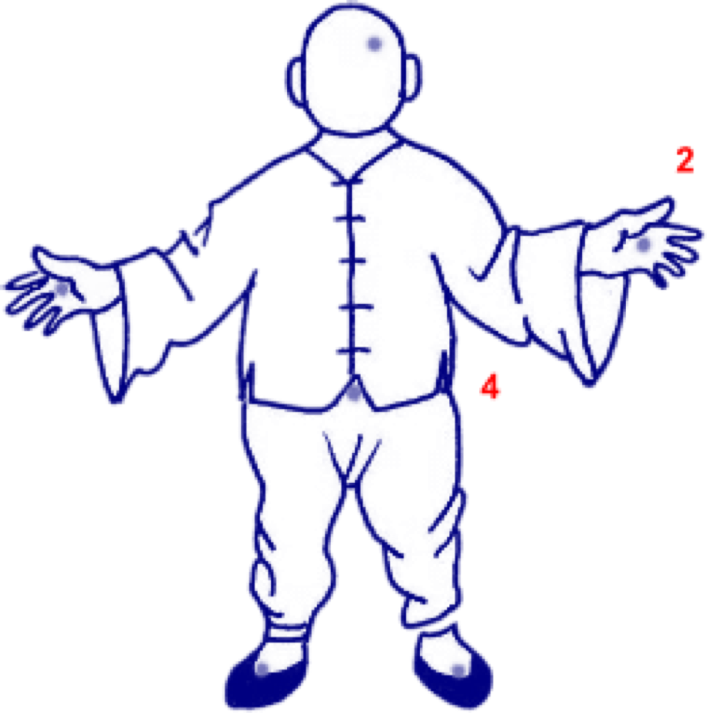 We verspringen steeds met een Ting van de kleine gong en wel Ting 2/3 tellen Ting 2/3 tellen enzovoort. We verspringen steeds in gedachte met de Ting van de ‘Gate Of Heaven’, waarbij de Ting steeds gevoelsmatig licht drukt op de in gedachte aan te raken plek/punten. Er zijn in totaal 6 aan te raken punten: